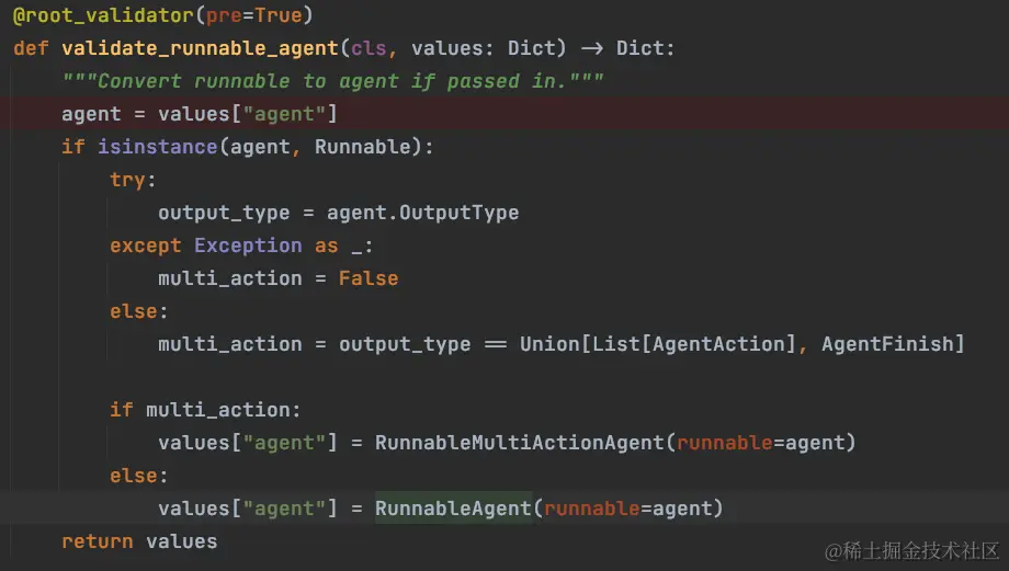 对于使用 LCEL 创建的管道对象进行类型转换,转成 RunnableAgent 对象,RunnableAgent 对象继承自 BaseSingleActionAgent
