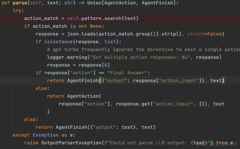 源码中支持传入一个指定的类作为格式化工具,如果我们不指定,那么它将使用自己集成的格式化工具: 源码:_output_parser = output_parser or cls._get_default_output_parser(llm=llm)这里的格式化逻辑,一定是与提示词中对大语言模型输出规范相匹配和适用的,我们要求 LLM 怎么给我们数据,就需要对应地去写什么样的解析逻辑来获取和组织数据。