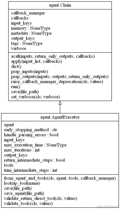 这是 AgentExecutor 的类图,可以看到它是继承了 chain,也就是说它具有 chain 所具有的所有功能,并且因为它是继承了 chain,所以我们在看代码的时候可以关注它的 _call 方法。