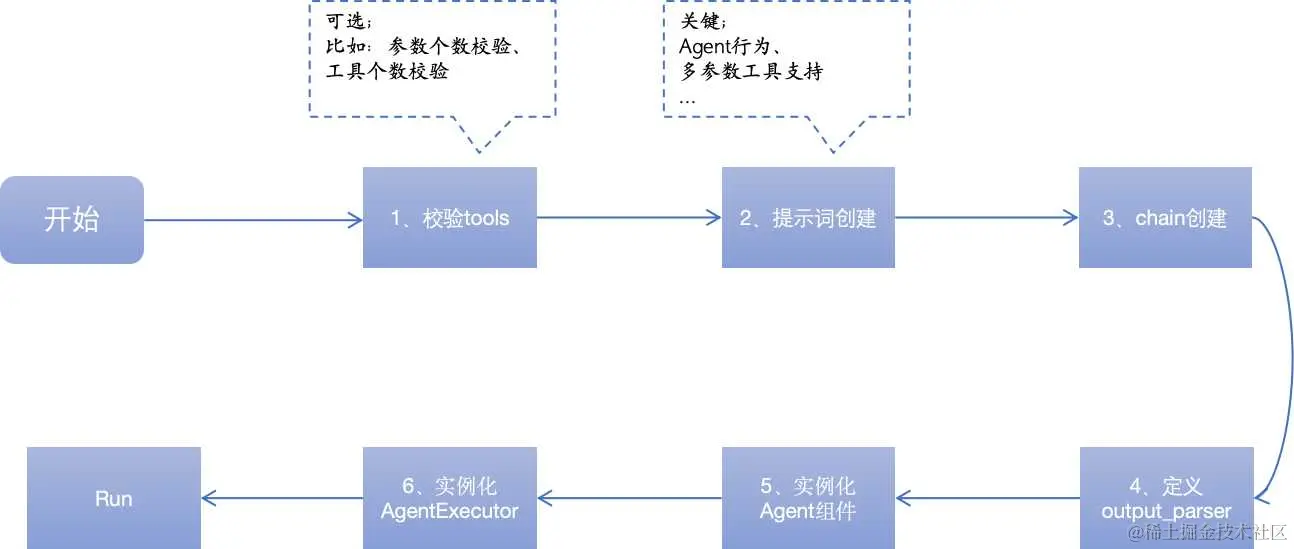 图中 1、2、3、4、5 的过程为初始化 Agent 的过程,6 为初始化 AgentExecutor 过程。