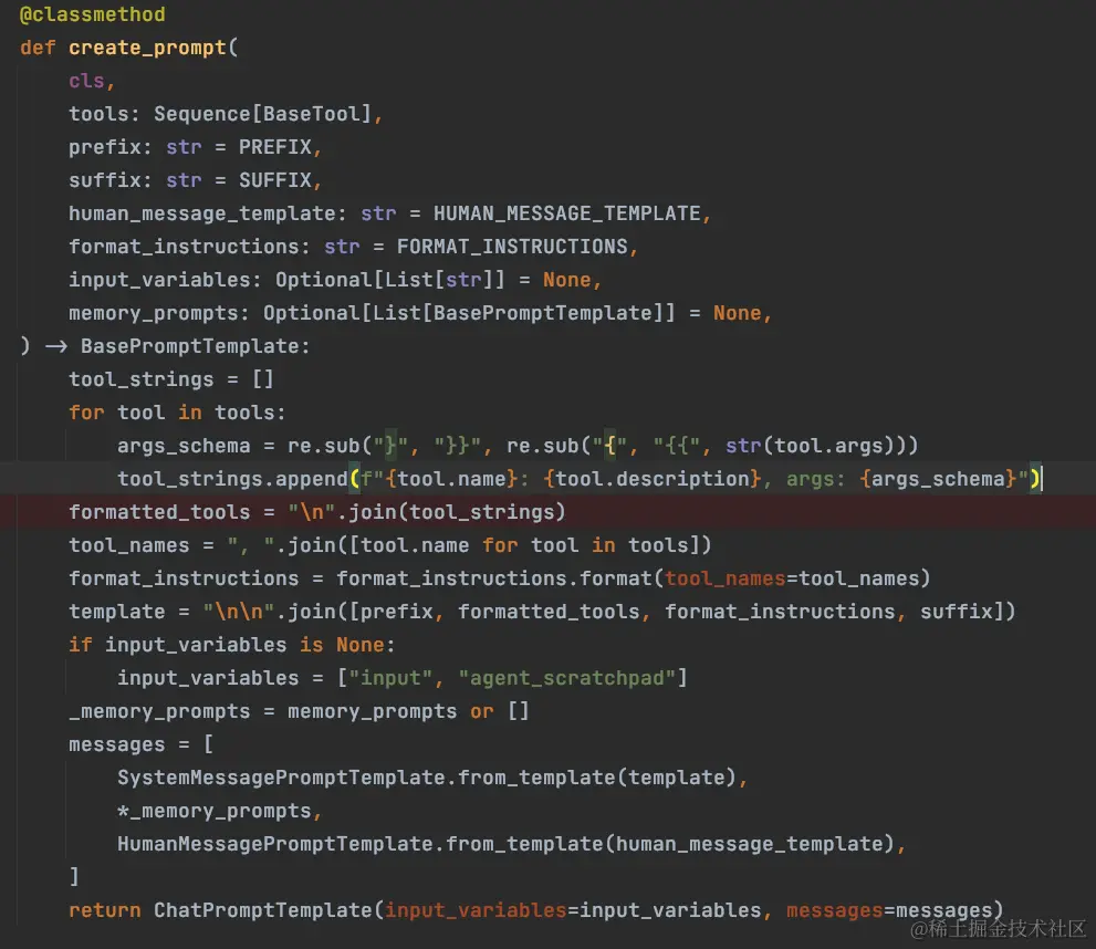prompt = hub.pull("hwchase17/structured-chat-agent") prompt = str(prompt).replace("\\n", "\n").replace("\\t", "\t") with open('promptstext/structured-chat-agent.text', "w") as file: file.write(prompt)当组件提示词有特殊逻辑时,我们可以覆写父类的 create_prompt 方法来实现;如下图所示是当前 agent 类型的提示词创建过程,提示词模板的处理主要是工具描述的组织,提示词其他部分都可以使用一些固定模板。
