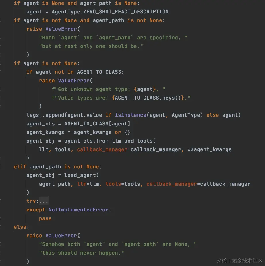 下图是调用 initialize_agent 方法初始化时的代码,总体只有两部分: