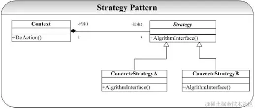 策略模式将逻辑(算法)封装到一个类(Context)里面,通过组合的方式将具体算法的实现在组合对象中实现,再通过委托的方式将抽象接口的实现委托给组合对象实现。策略模式可以在运行时方便地根据需要在各个算法之间进行切换,同时也解耦了稳定部分和变化部分,变化部分很容易被其他类进行复用。缺点是:多了一个类和一些接口;当变化部分ConcreteStrategy需要使用稳定部分Context中的内部数据和方法时,不太方便。(可类比:旅游出行)