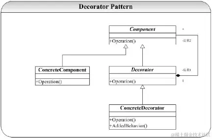装饰模式通过组合而非继承的方式,实现了在运行时动态扩展对象职责的能力,而且可以根据需要扩展多个职责,避免了使用继承带来的灵活性差和多子类衍生问题。Decorator类在接口上表现为is-a Component的继承关系,即Decorator类继承了Component类所具有的接口。但在实现上又表现为has-a Component的组合关系,即Decorator类又使用了另外一个Component类。(可类比:杂粮饼)