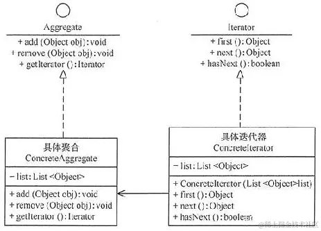 1、在客户程序与聚合对象之间插入一个迭代器,由迭代器专门负责遍历工作,这分离了聚合对象与其遍历行为,对客户也隐藏了其内部细节 —— 迭代器(Iterator)模式。