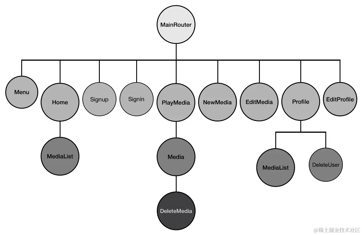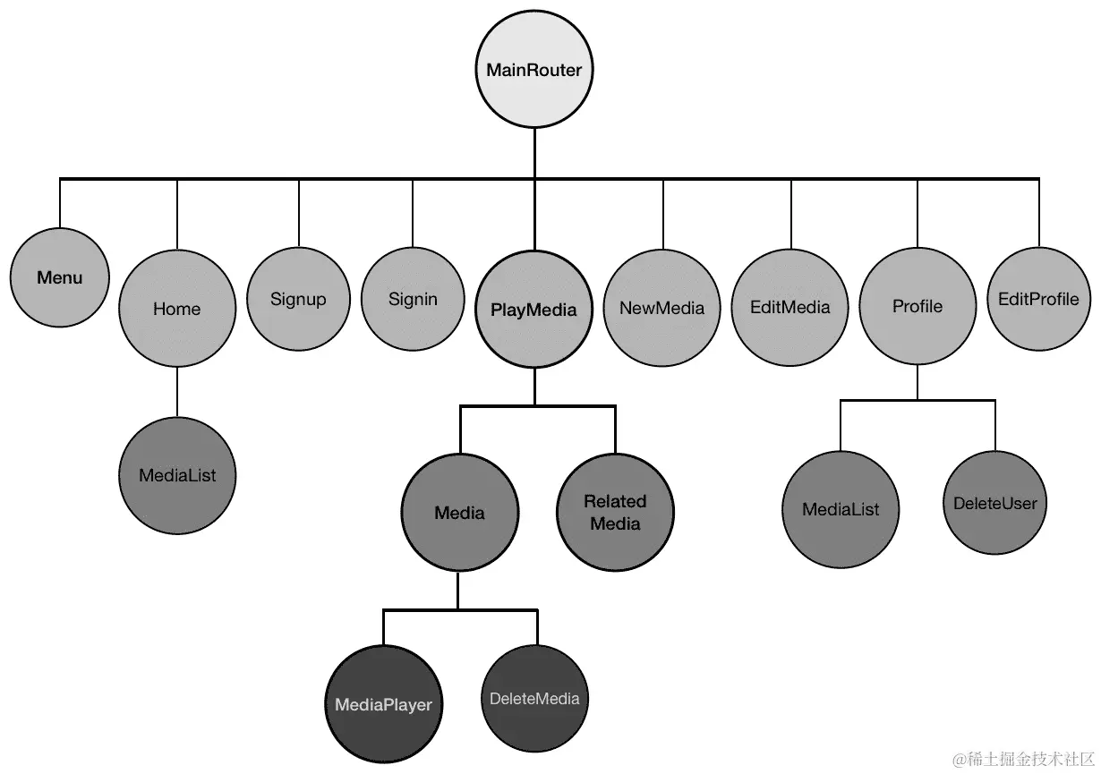 为了实现与媒体上传、编辑和流媒体相关的功能所需的视图,我们将通过扩展和修改 MERN 骨架应用程序中的现有 React 组件来开发。下图显示了构成本章中开发的 MERN Mediastream 前端的所有自定义 React 组件的组件树: