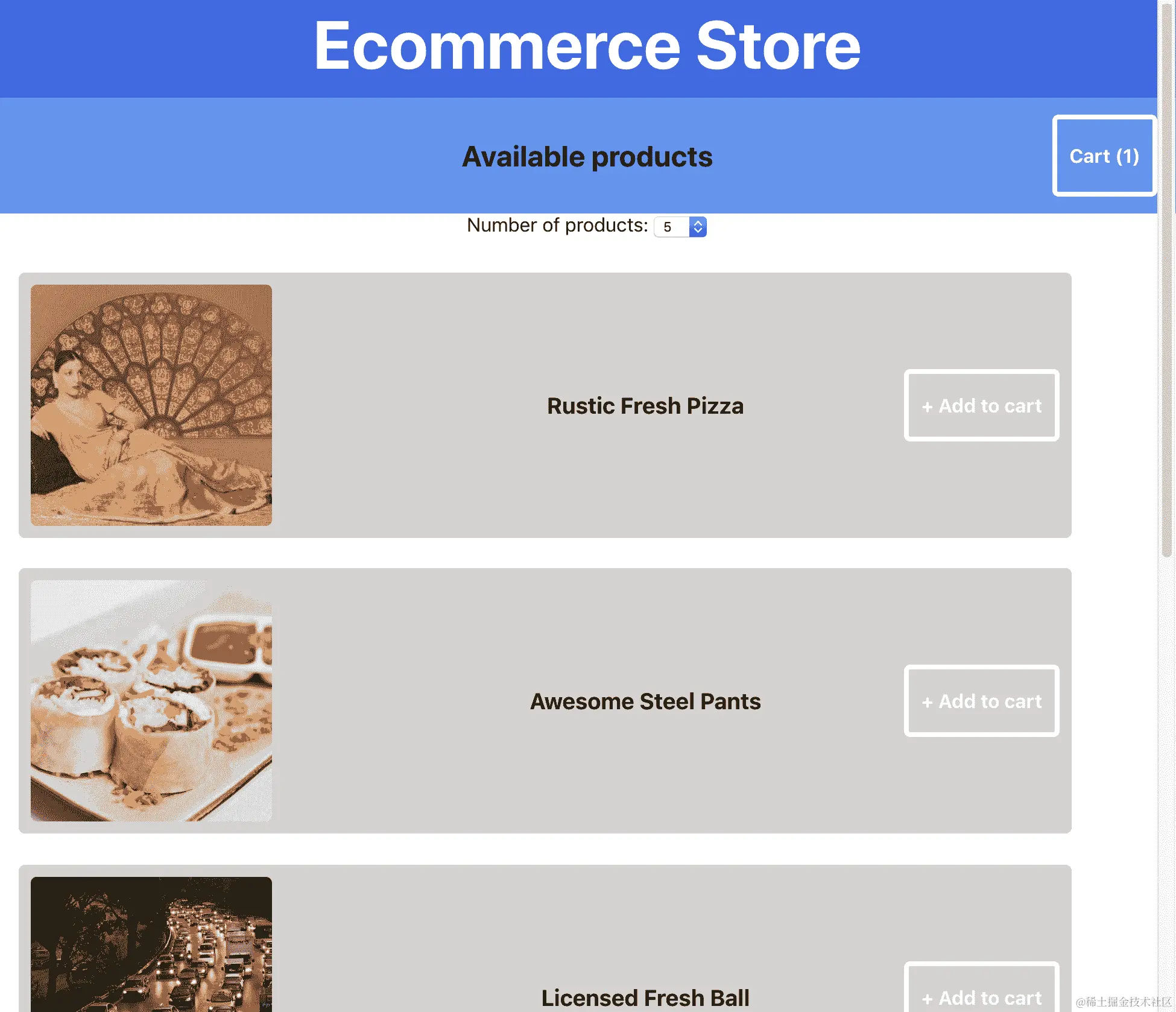 在client/src目录中,您将找到应用程序的入口点,即index.js。该文件将引用App.js中的App组件。App组件具有一个Router组件,根据用户访问的 URL,它将呈现Products或Cart组件。当未指定特定路由时,将呈现Products组件,其中包括SubHeader组件,带有指向Cart组件的Button,以及返回显示产品信息的ProductItem组件列表的map函数。/cart路由将呈现Cart组件,该组件还具有SubHeader,这次带有返回到上一页的Button。同样,将返回产品列表,并且Totals组件将显示购物车中产品的总数。