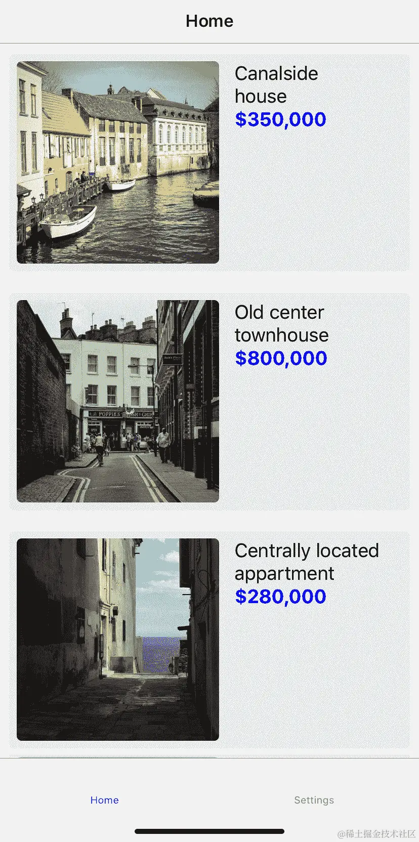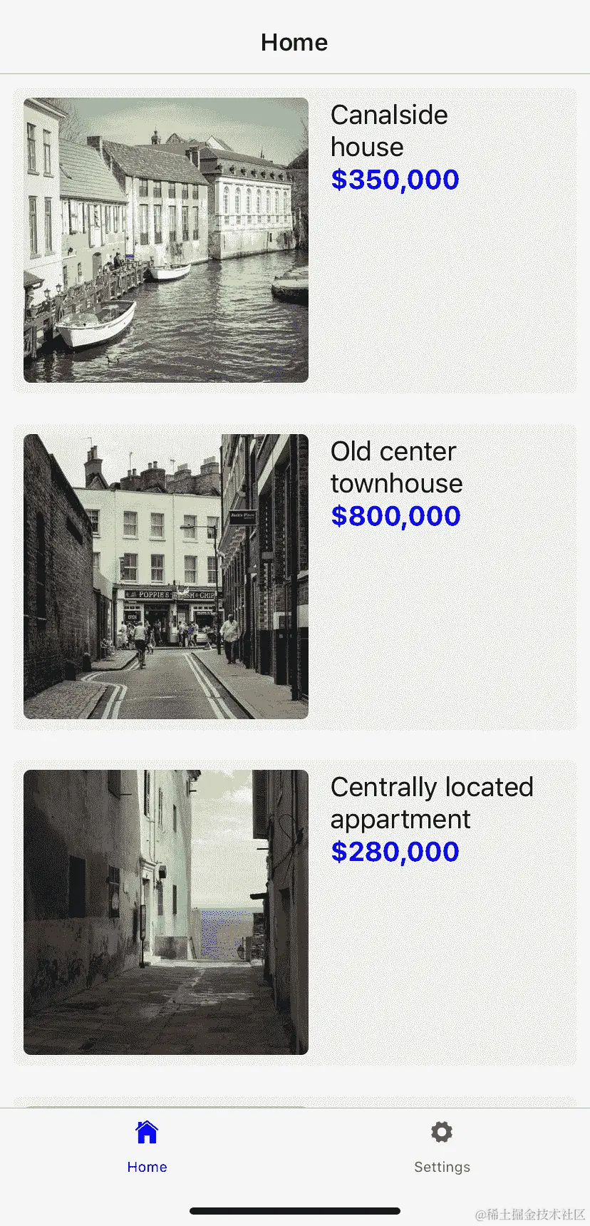 正如您所看到的,一些组件将由ListingDetail组件呈现。还从react-native中导入了Dimensions模块。这个模块可以帮助您获取应用程序正在运行的设备的屏幕尺寸。通过获取宽度,您可以在用户屏幕的整个宽度上显示图像。