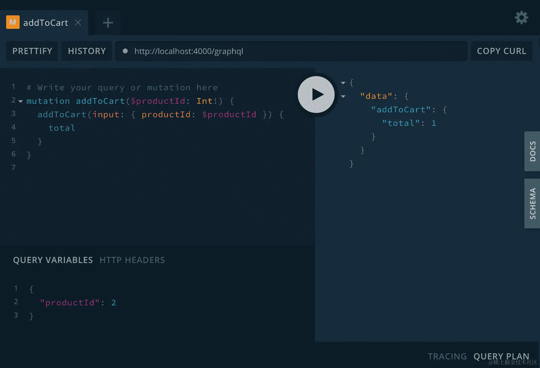 每当您在此页面的左侧描述查询或突变时,服务器返回的输出将显示在播放器的右侧。构造 GraphQL 查询的方式将决定返回数据的结构,因为 GraphQL 遵循“请求所需内容,获得确切内容”的原则。由于 GraphQL 查询始终返回可预测的结果,这意味着我们可以有这样的查询: