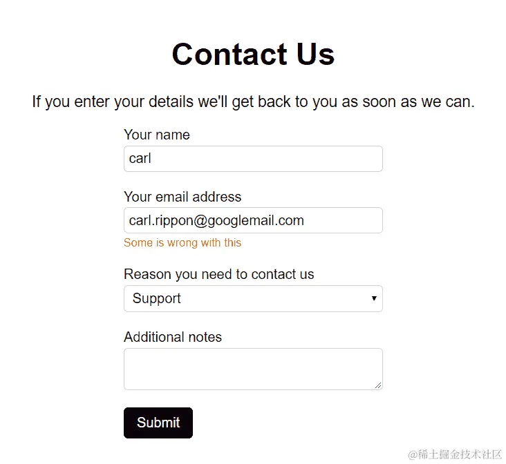 如果我们转到正在运行的应用程序中的联系我们页面,填写表单并单击提交按钮,我们会收到有关电子邮件字段存在问题的通知,这是我们所期望的: