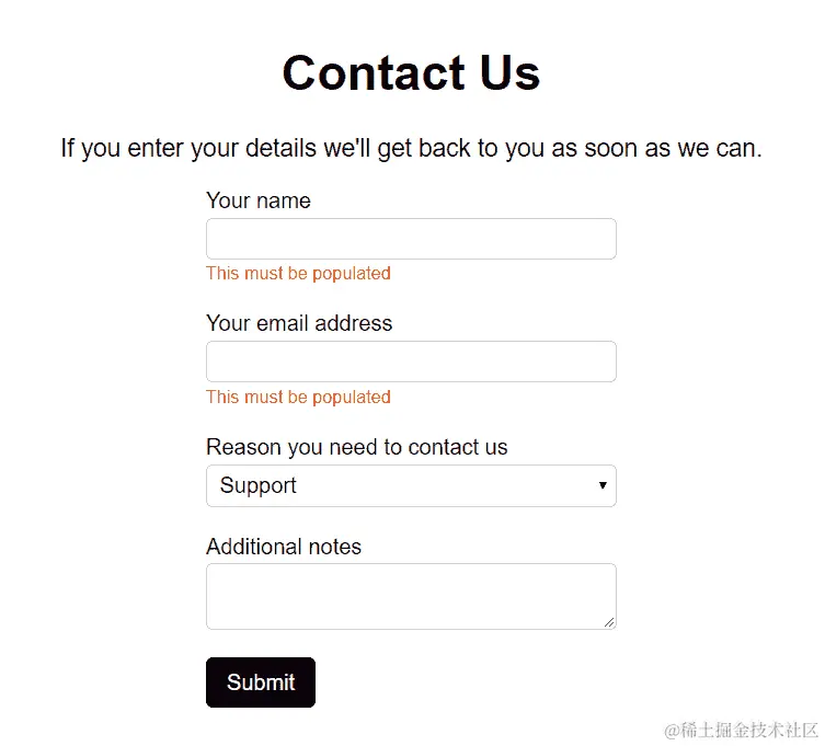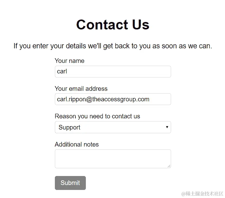 最后,我们添加了在使用通用Form组件时处理表单提交的能力。我们的联系我们页面已更改为使用通用的Form和Field组件。