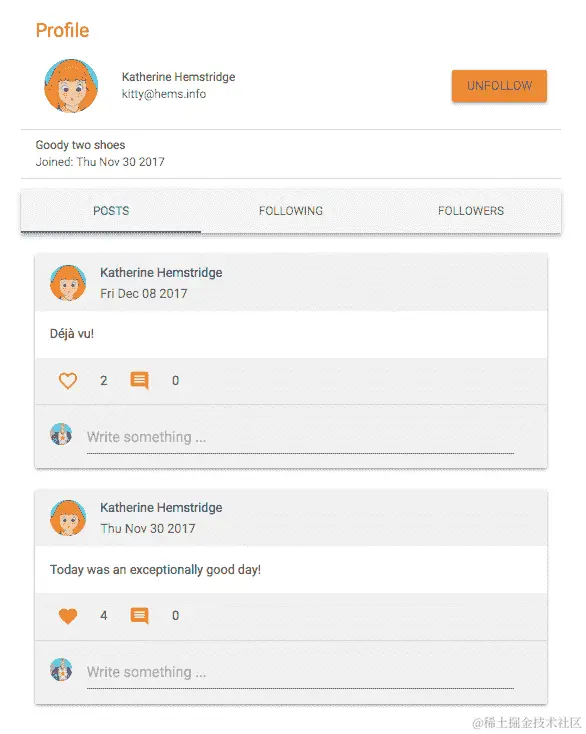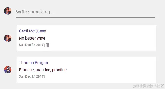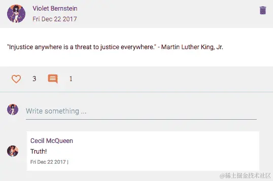 每篇帖子中的评论部分将允许已登录用户添加评论,查看评论列表,并删除自己的评论。评论列表的任何更改,例如新添加或删除,都将更新评论,以及Post组件的操作栏部分中的评论计数: