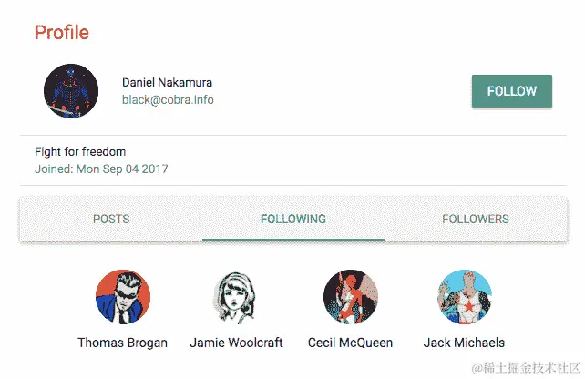 个人资料页面:获取并显示单个用户信息的组件,只有已登录用户才能访问,并且还包含编辑和删除选项,仅当已登录用户查看自己的个人资料时才可见