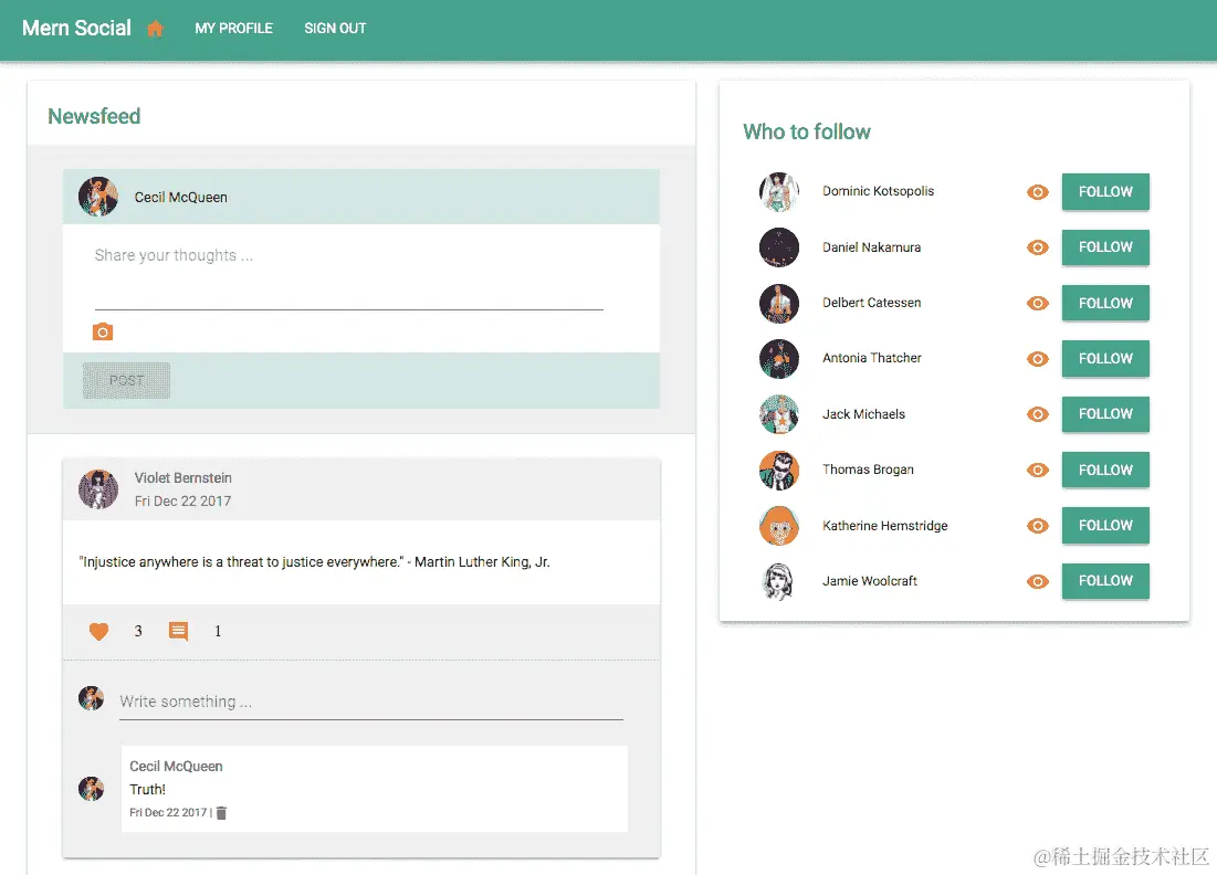 MERN 社交应用程序已经完整地具备了我们之前为应用程序定义的功能集。用户可以更新其个人资料,上传照片和描述,在应用程序上互相关注,并创建带有照片和文字的帖子,以及对帖子点赞和评论。这里展示的实现可以进一步调整和扩展,以添加更多功能,利用 MERN 堆栈的工作机制。