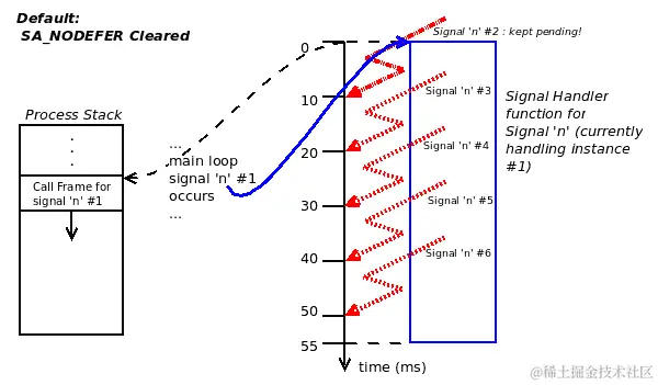正如我们在第三章中学到的,资源限制,典型的进程堆栈资源限制为 8 MB;因此,我们真的有可能溢出堆栈,这将导致致命的突然崩溃。所以,请小心!如果你打算使用SA_NODEFER标志,请费点功夫在大负载下对你的应用进行压力测试,看看是否使用了比安全更多的堆栈。