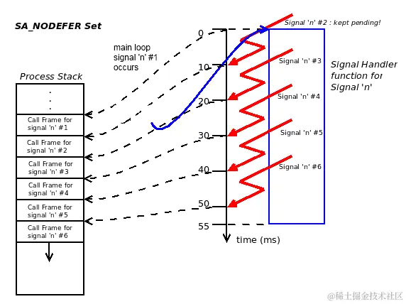 设置SA_NODEFER信号标志并在信号到达时处理所有信号。 | 简单直接的方法。 | 在负载下,堆栈使用量大,存在堆栈溢出的危险。 |