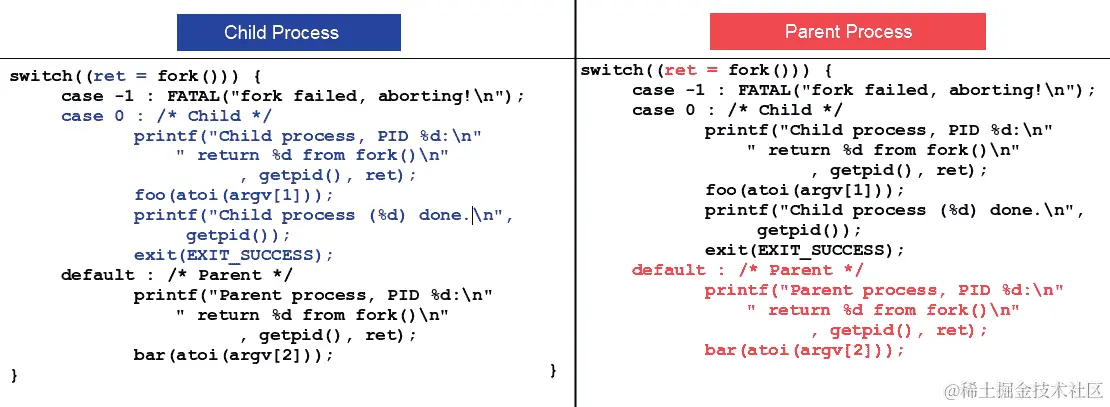 Fork 规则#1:成功 fork 后,父进程和子进程中的执行都将继续在 fork 后的指令处进行。