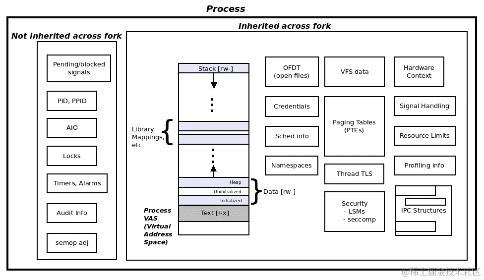 然而,不止于此:进程不仅仅是它的虚拟地址空间。这包括打开的文件,进程凭证,调度信息,文件系统结构,分页表,命名空间(PID 等),审计信息,锁,信号处理信息,定时器,警报,资源限制,IPC 结构,性能(perf)信息,安全(LSM)指针,seccomp,线程栈和 TLS,硬件上下文(CPU 和其他寄存器),等等。