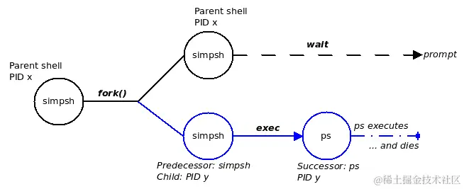 为什么会这样呢?嗯,想一想:fork的工作是在子进程中创建父进程的(几乎)相同的副本;这包括硬件上下文(前面提到的),当然也包括指令指针(IP)寄存器(有时称为程序计数器(PC))本身!因此,子进程也将在与父进程相同的位置执行用户模式代码。由于fork成功,控制不会转到错误处理代码(FATAL()宏);相反,它将转到printf。*关键是:这将在(原始)父进程和(新的)子进程中都发生。*因此输出。