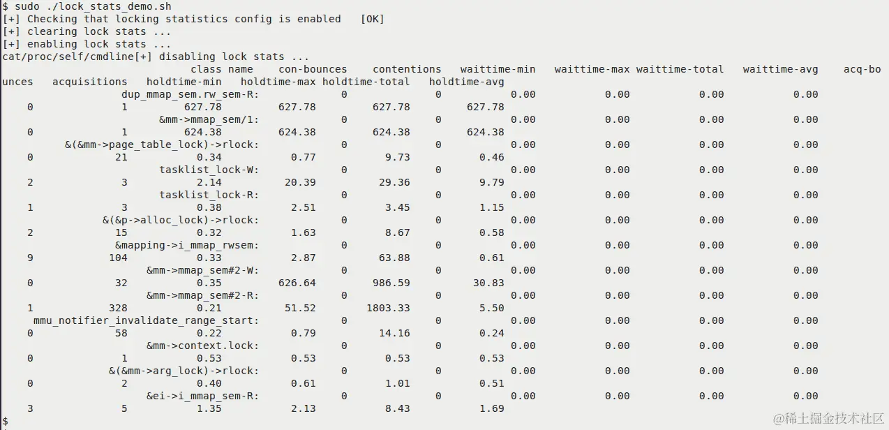 | 启用锁统计 | sudo sh -c "echo 1 > /proc/sys/kernel/lock_stat" |