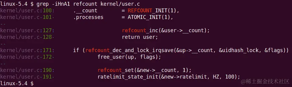 内核中另一个使用 refcounting API 的例子可以在kernel/user.c中找到(它有助于跟踪用户通过每个用户结构声明的进程、文件等的数量):
