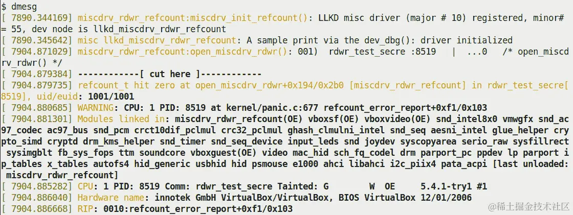 图 13.2 - (部分)屏幕截图显示当我们错误地尝试将 refcount_t 变量设置为<= 0 时,WARN()宏触发