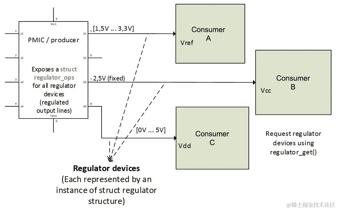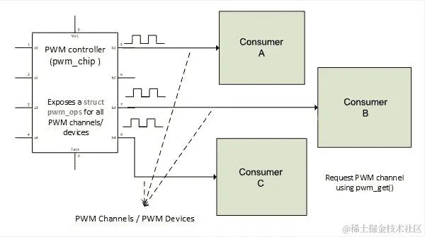 消费者接口:由控制器公开的使用 PWM 线的设备。此类设备的驱动程序使用控制器导出的辅助函数,通过通用 PWM 框架。