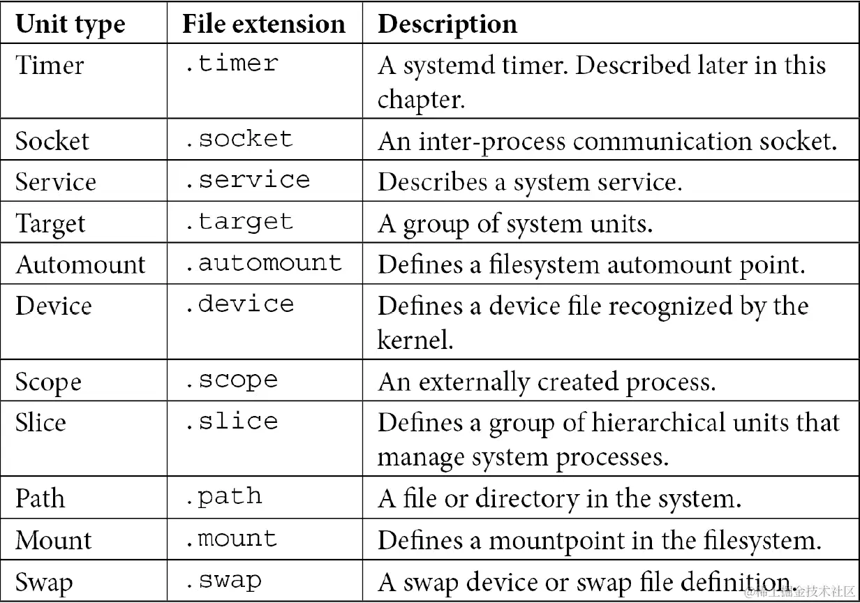 Systemd具有单位的概念,它们只是配置文件。这些单位可以根据其文件扩展名进行分类为不同类型: