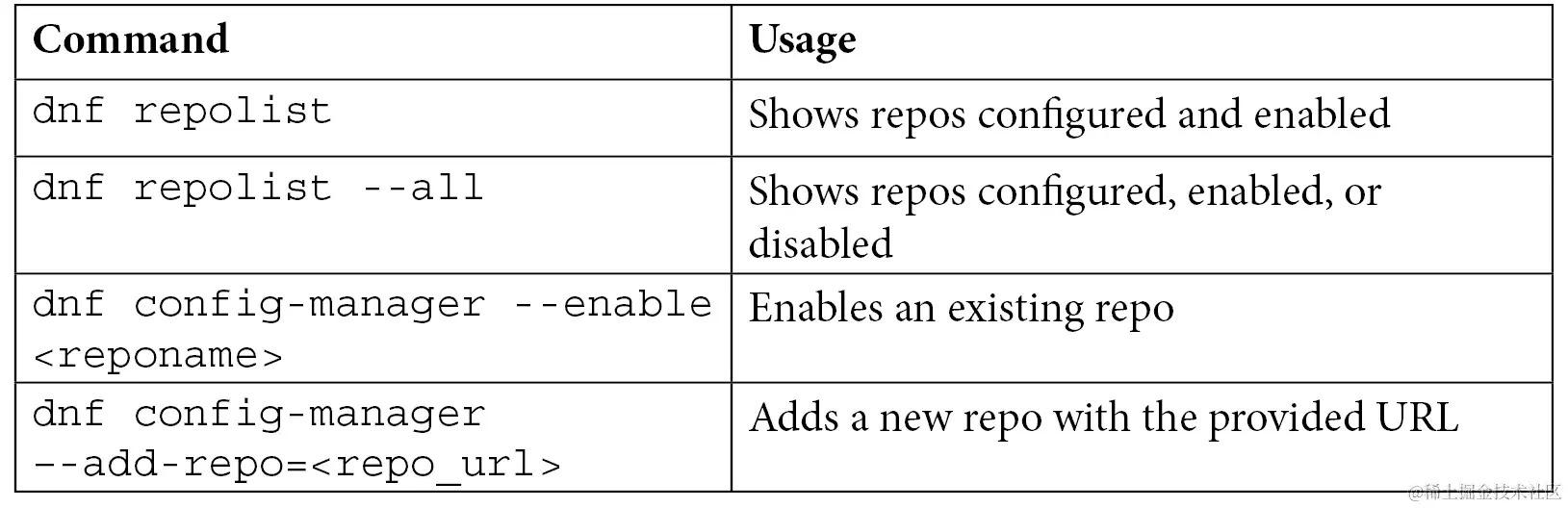 像许多其他 Linux 发行版一样,RHEL 有一个基于存储库提供软件的机制。这些存储库包含软件包的列表(可以是最终用户应用程序,如 Firefox,或者用于它们的组件,如 GTK3),软件包之间的依赖关系列表以及其他有用的元数据。