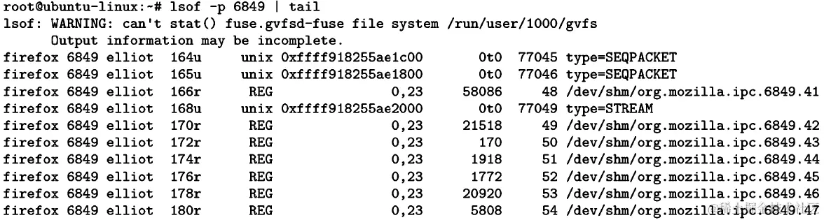 您还可以使用lsof命令列出进程当前正在使用的所有文件: