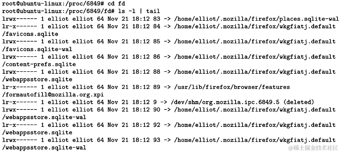 Linux 中的每个进程都由/proc中的一个目录表示。例如,如果您的 Firefox 进程的 PID 为6849,那么目录/proc/6849将表示 Firefox 进程: