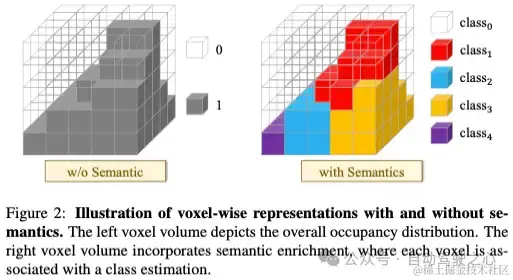 占用感知源于占用网格映射(OGM),这是移动机器人导航中的一个经典主题,旨在从有噪声和不确定的测量中生成网格图。该地图中的每个网格都被分配了一个值,该值对网格空间被障碍物占据的概率进行评分。语义占用感知源于SUNCG,它从单个图像中预测室内场景中所有体素的占用状态和语义。然而,与室内场景相比,研究室外场景中的占用感知对于自动驾驶来说是必不可少的。MonoScene是仅使用单眼相机进行户外场景占用感知的开创性工作。特斯拉在2022年CVPR自动驾驶研讨会上宣布了其全新的纯视觉的占用网络,与MonoScene并驾齐驱。这个新网络根据环绕视图RGB图像全面了解车辆周围的3D环境。随后,占用感知引起了广泛关注,推动了近年来自动驾驶占用感知研究的激增。