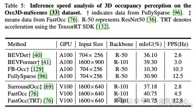 最近关于3D占用感知的研究不仅开始考虑感知的准确性,还开始考虑其推理速度。根据FastOcc和FullySparse提供的数据,我们梳理了3D占用方法的推理速度,并在Occ3D nuScenes数据集上报告了它们的运行平台、输入图像大小、骨干架构和占用精度,如表5所示。