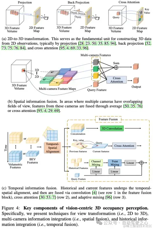(2)时间信息融合:基于视觉的BEV感知系统的最新进展表明,整合时间信息可以显著提高感知性能。同样,在基于视觉的占用感知中,可以通过结合历史特征和当前感知输入的相关信息来提高准确性和可靠性。时间信息融合过程由两个部分组成:时间-空间对齐和特征融合,如图4c所示。
