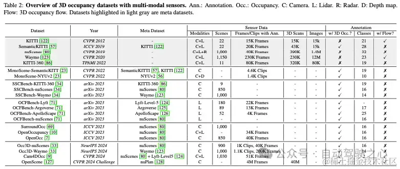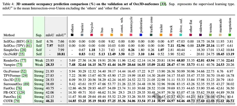 (3)监督比较。“主管”表4的列概述了用于训练占用网络的监督学习类型。具有强大监督的培训,直接使用3D占用标签,是最普遍的类型。表4显示,基于强监督学习的占用网络取得了令人印象深刻的性能。FastOcc、FB Occ、PanoOcc和COTR的mIoU得分显著高于弱监督或自监督方法(mIoU增加12.42%-38.24%)。这是因为数据集提供的占用标签经过了高精度的标注,并且可以对网络训练施加强大的约束。然而,注释这些密集的占用标签既费时又费力。有必要探索基于薄弱或自我监督的网络培训,以减少对占用标签的依赖。Vampire是基于弱监督学习的表现最好的方法,其mIoU得分为28.33%。这表明语义激光雷达点云可以监督三维占用网络的训练。然而,语义激光雷达点云的收集和注释是昂贵的。SelfOcc和OccNeRF是基于自我监督学习的两部具有代表性的占有作品。它们利用体积渲染和光度一致性来获取自监督信号,证明网络可以在没有任何标签的情况下学习3D占用感知。然而,它们的性能仍然有限,SelfOcc的mIoU为7.97%,OccNeRF的mIoU*为10.81%。