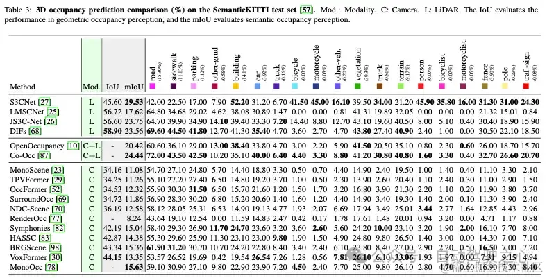 (2)模态比较。输入数据模态显著影响3D占用感知准确性。“Mod.”表3中的列报告了各种占用方法的输入模式。可以看出,由于激光雷达传感提供了准确的深度信息,以激光雷达为中心的占用方法具有更精确的感知,IoU和mIoU得分更高。例如,S3CNet具有最高的mIoU(29.53%),DIFs实现了最高的IoU(58.90%)。我们观察到,这两种多模态方法并不优于S3CNet和DIF,这表明它们没有充分利用多模态融合的优势和输入数据的丰富性。在多模式占用感知方面有相当大的进一步改进潜力。此外,尽管近年来以视觉为中心的占用感知发展迅速,但从表3可以看出,最先进的以视觉为核心的占用方法在IoU和mIoU方面与以激光雷达为中心的方法仍有差距。我们认为有必要进一步改进以视觉为中心的方法的深度估计。
