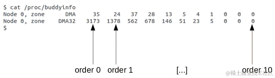 图 8.3 - 样本/proc/buddyinfo 输出的带注释的屏幕截图