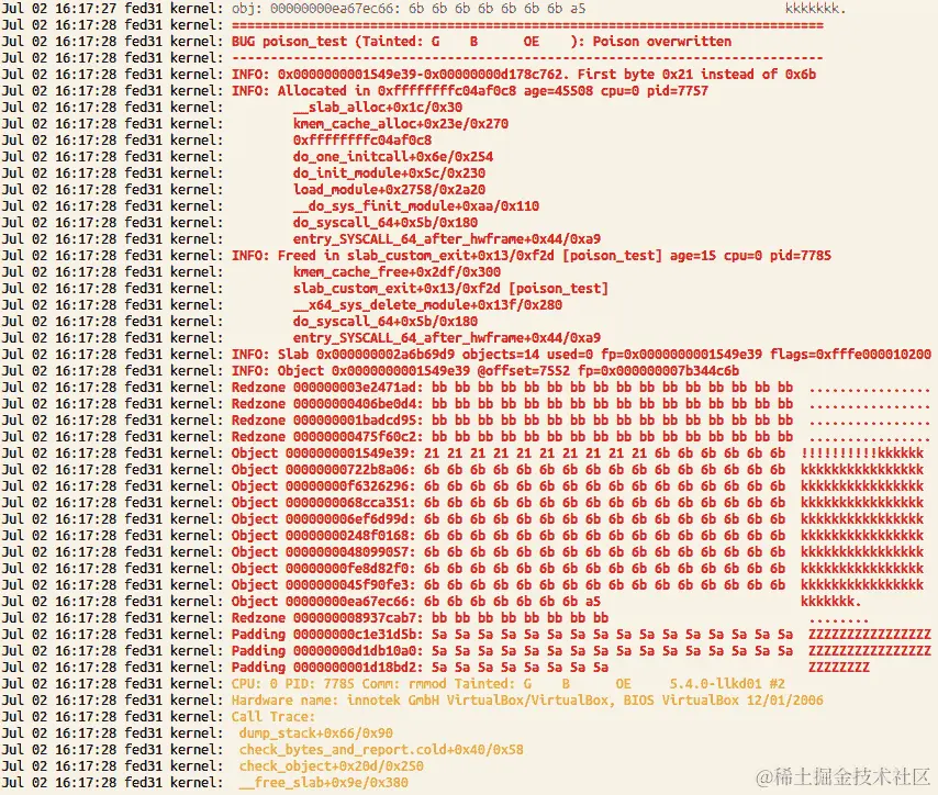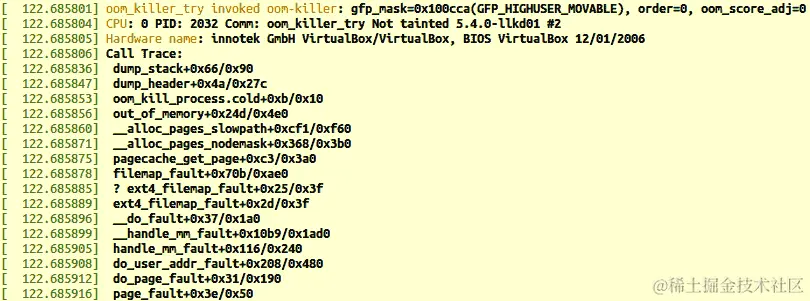 查看内核日志后,确实发现 OOM killer 来过了!请注意,以下部分截图仅显示了在运行 5.4.0 内核的 x86_64 Fedora 31 虚拟机上的堆栈转储: