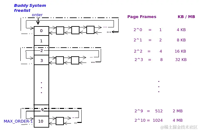 重要的是要注意每个块都保证是物理连续的 RAM。还要注意,给定顺序上的内存块的大小始终是前一个顺序的两倍(并且是下一个顺序的一半)。当然,这是因为它们都是 2 的幂。