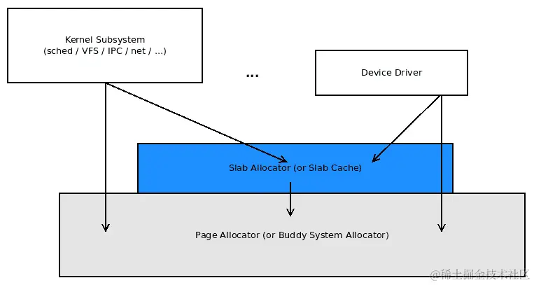因此,slab 分配器是建立在页面分配器之上的。各种核心内核子系统以及内核中的非核心代码,如设备驱动程序,都可以直接通过页面分配器或间接通过 slab 分配器分配(和释放)内存;以下图表说明了这一点: