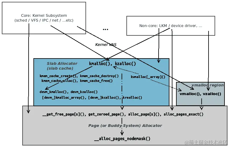 整个 Linux 内核及其所有核心组件和子系统(不包括内存管理子系统本身)最终都使用页面分配器(或 BSA)进行内存(de)分配。这包括非核心内容,如内核模块和设备驱动程序。