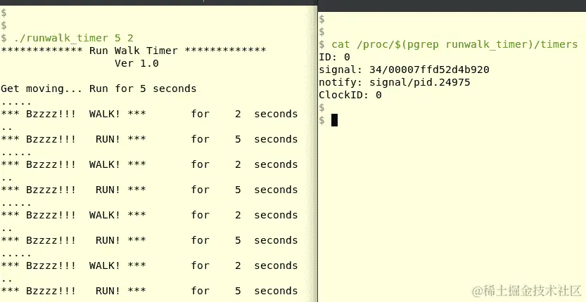 左侧的终端窗口是runwalk_timer应用程序运行的地方;当它正在运行时,在右侧的终端窗口中,我们查找 proc 文件系统的伪文件/proc/<PID>/timers。输出清楚地显示了以下内容: