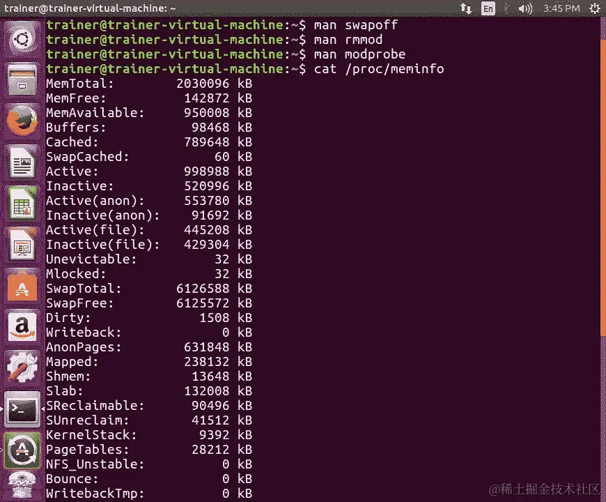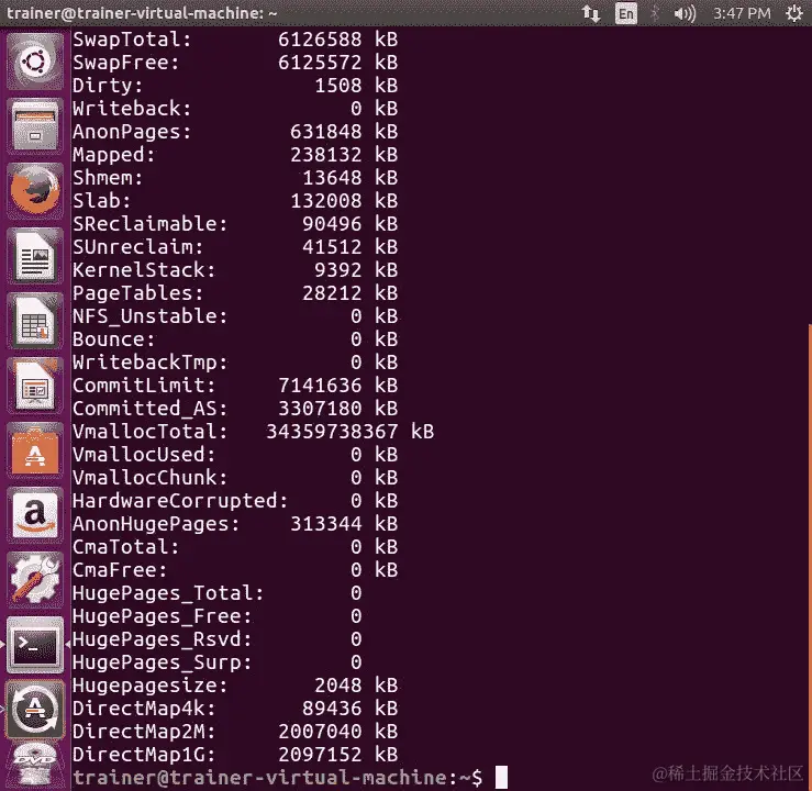 再次使用 Linux 系统进行演示,我们将查看/cat /proc/meminfo命令的输出: