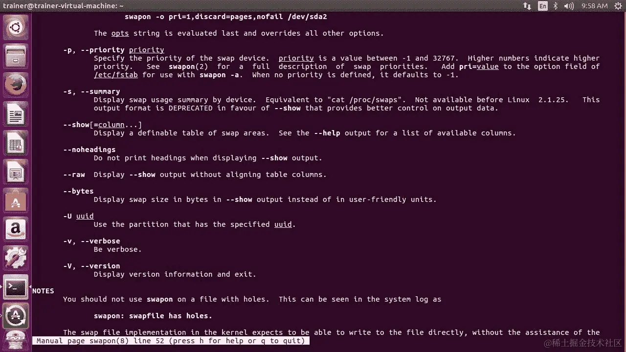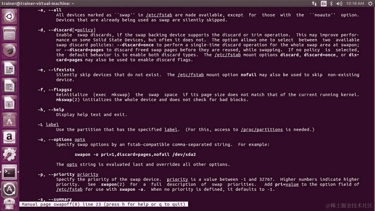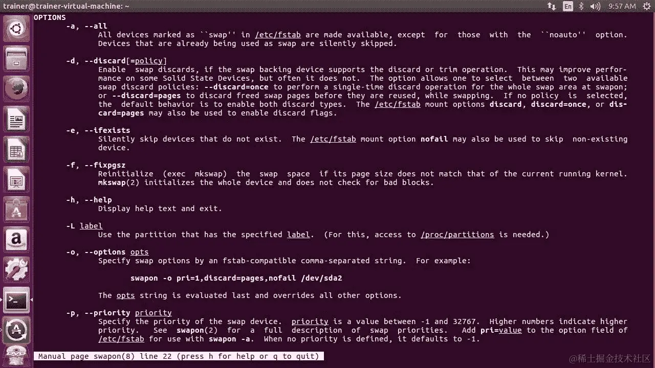 在 Ubuntu 发行版上,swapon命令可以传递更多选项,如下截图所示: