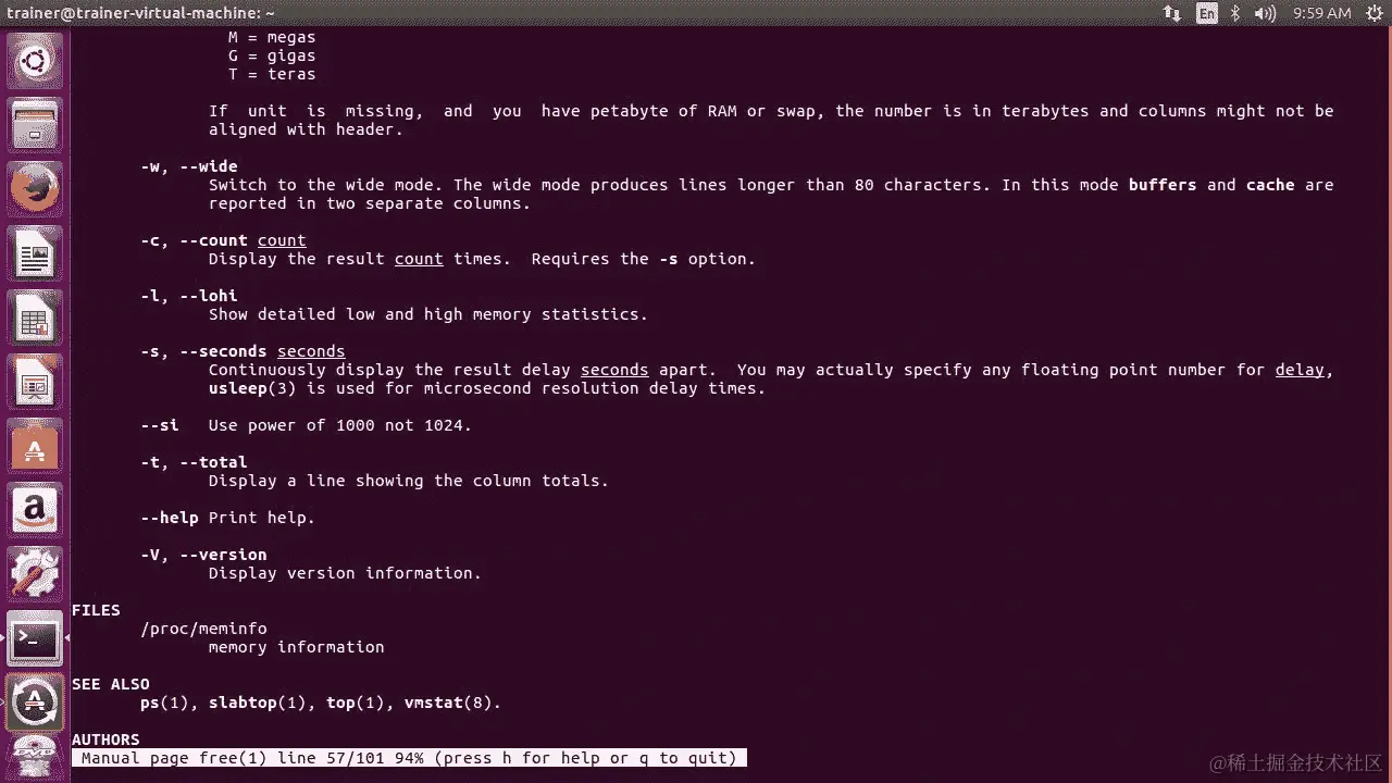 仅运行free命令将以 KB 为单位给出前面的结果。我们可以在free命令上添加一些选项以使其更加明确。以下是我们可以在 Ubuntu 发行版上使用的free命令的选项列表: