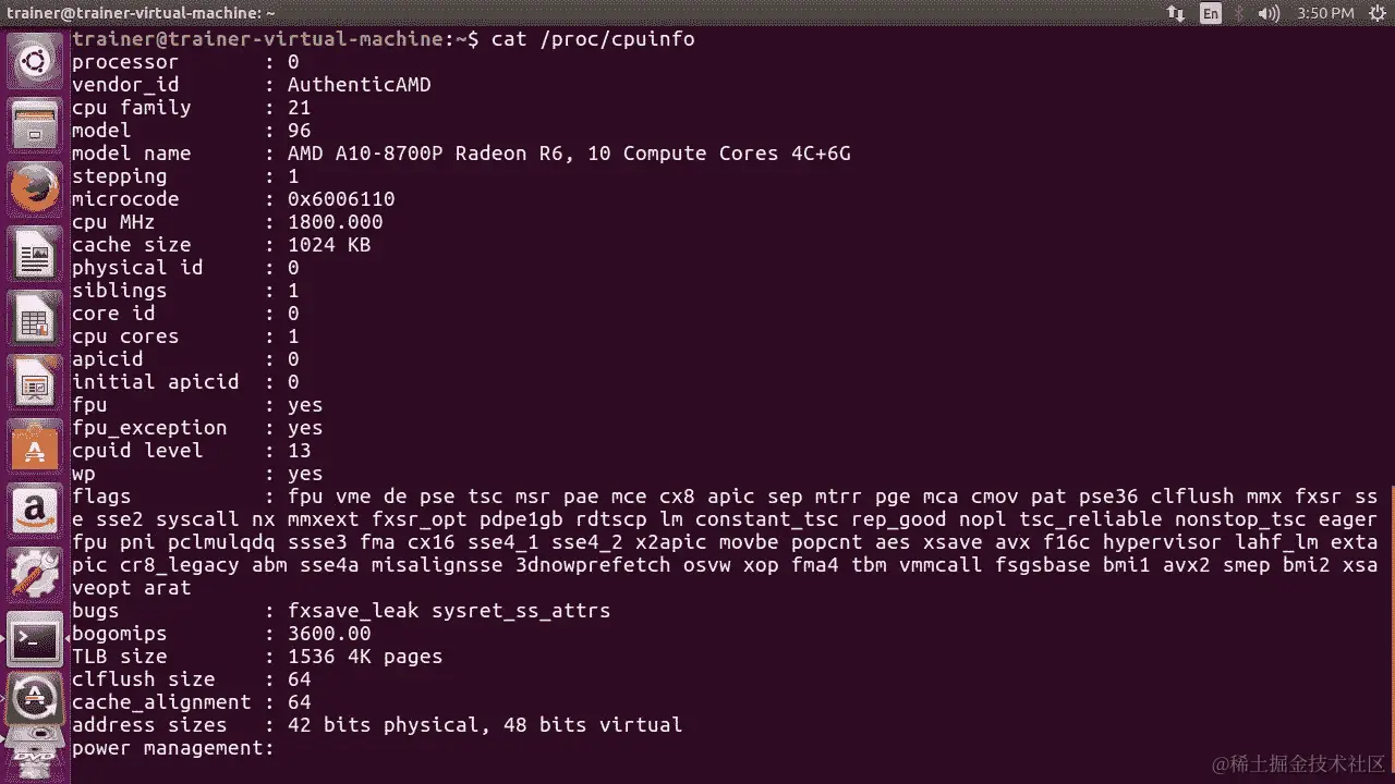 从前面的输出中,我们可以看到有关我们运行cat /proc/cpuinfo命令的 CPU 的详细信息。