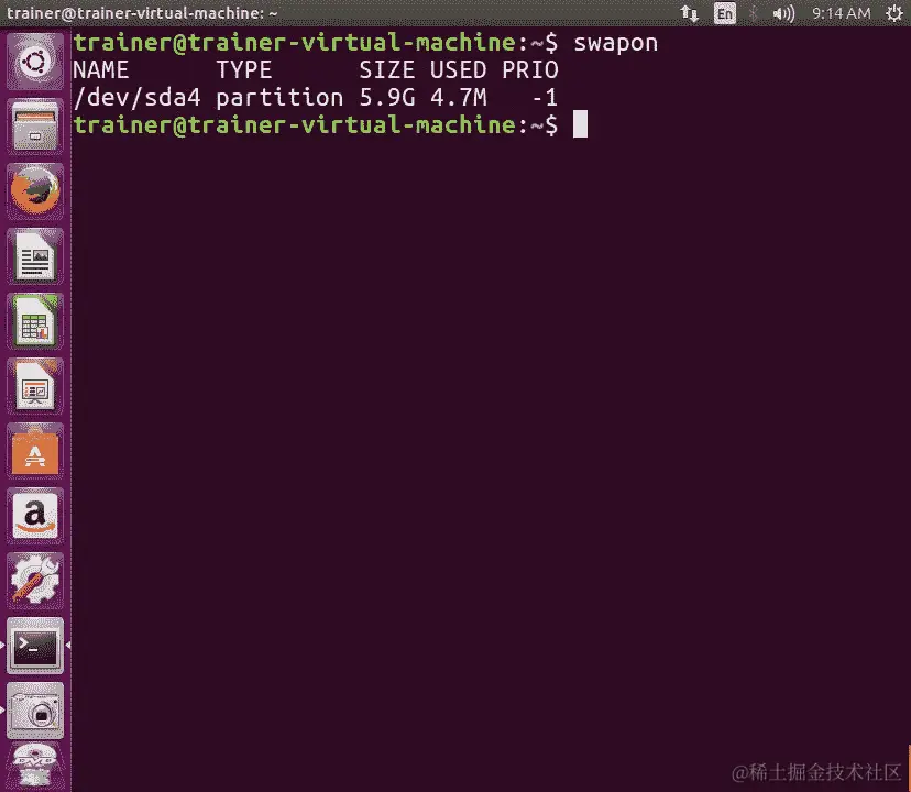 在前面的截图中,我们不仅显示了 RAM 信息,还显示了我们的交换内存。它显示在最后一行。如果我们只想看到交换内存,我们可以使用另一个命令swapon: