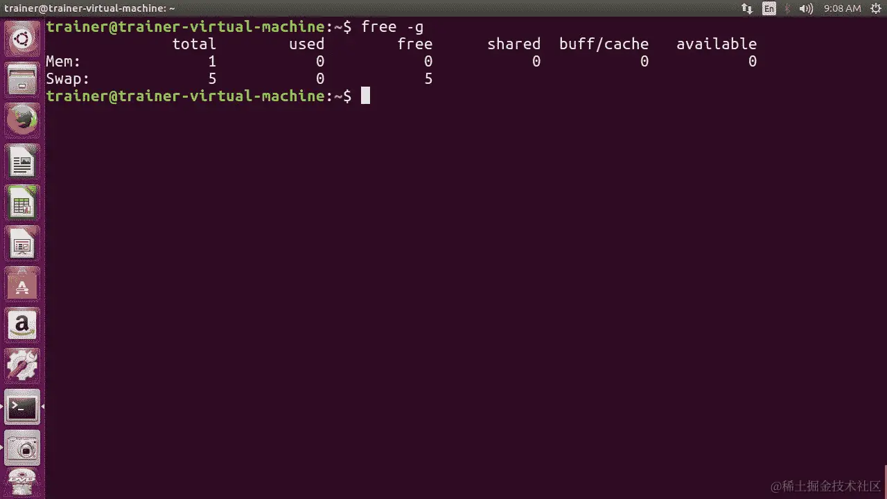 前面的输出是free命令中最常用的选项之一(-h)。我们甚至可以进一步使用(-g)选项来显示以 GB 为单位的物理内存总量: