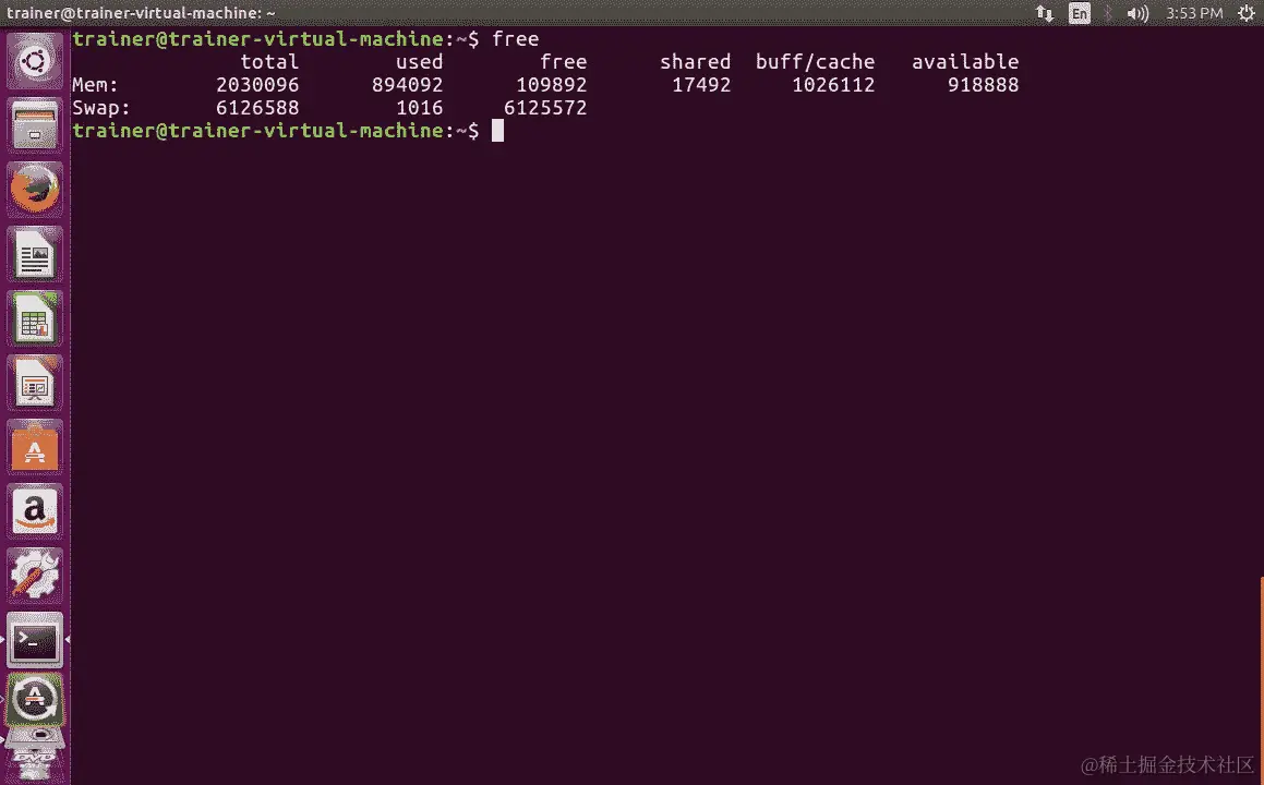 现在让我们再看另一个命令,即free命令。这个命令将以更易读的格式给出内存信息。使用我们的测试 Linux 系统,我们将运行free命令: