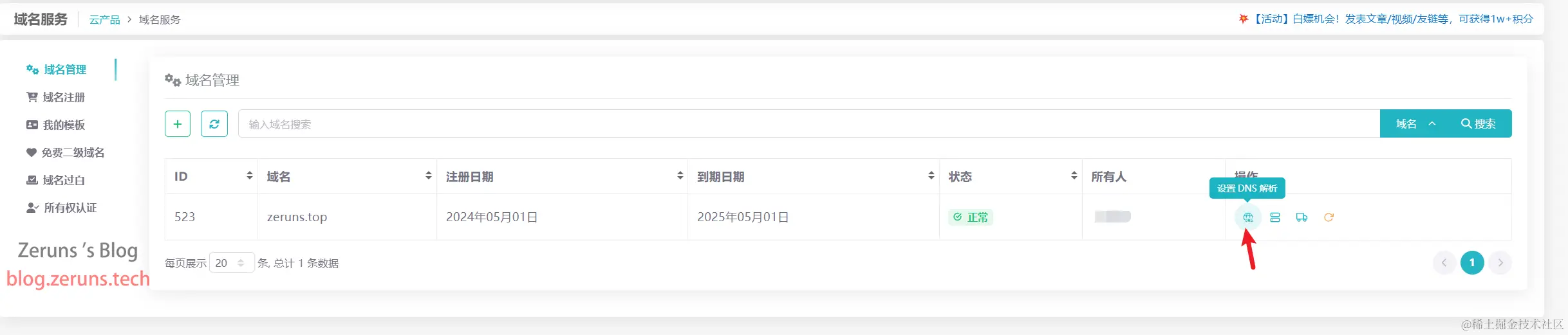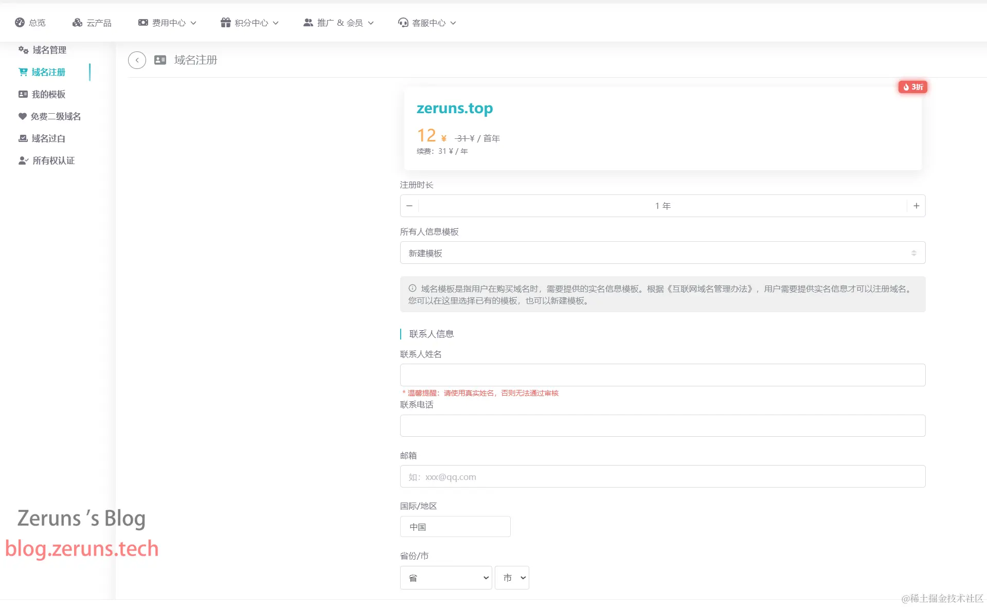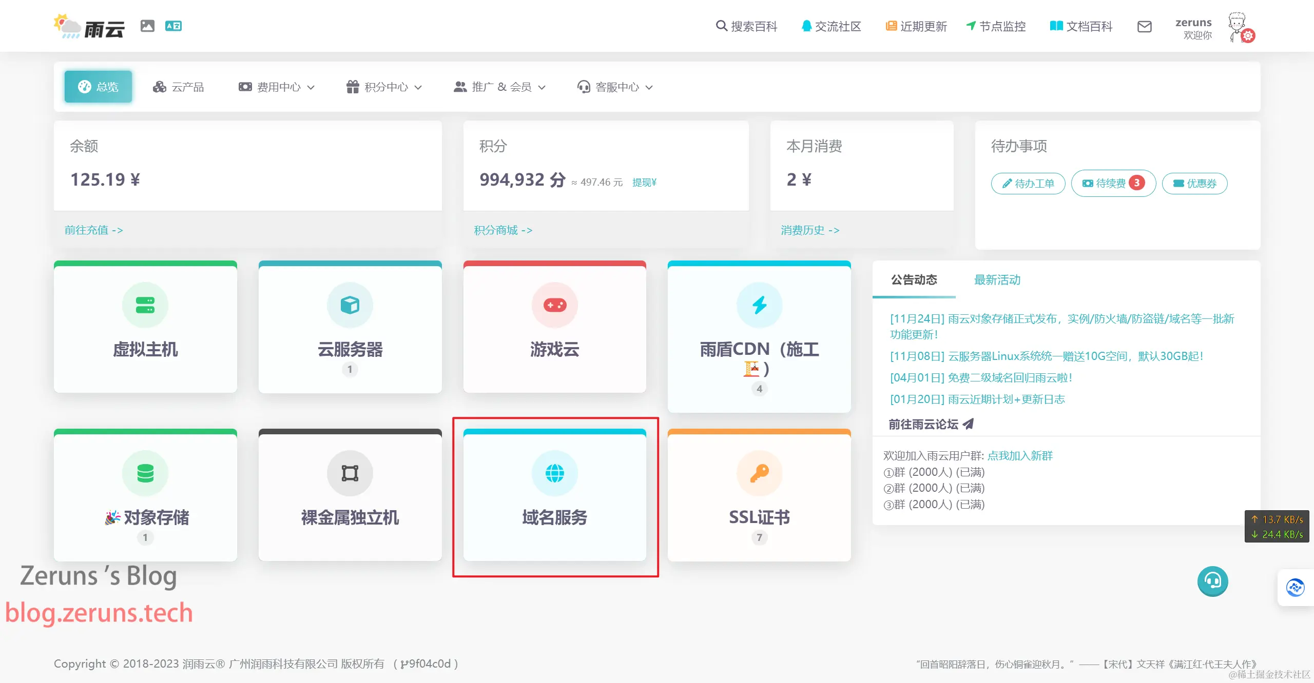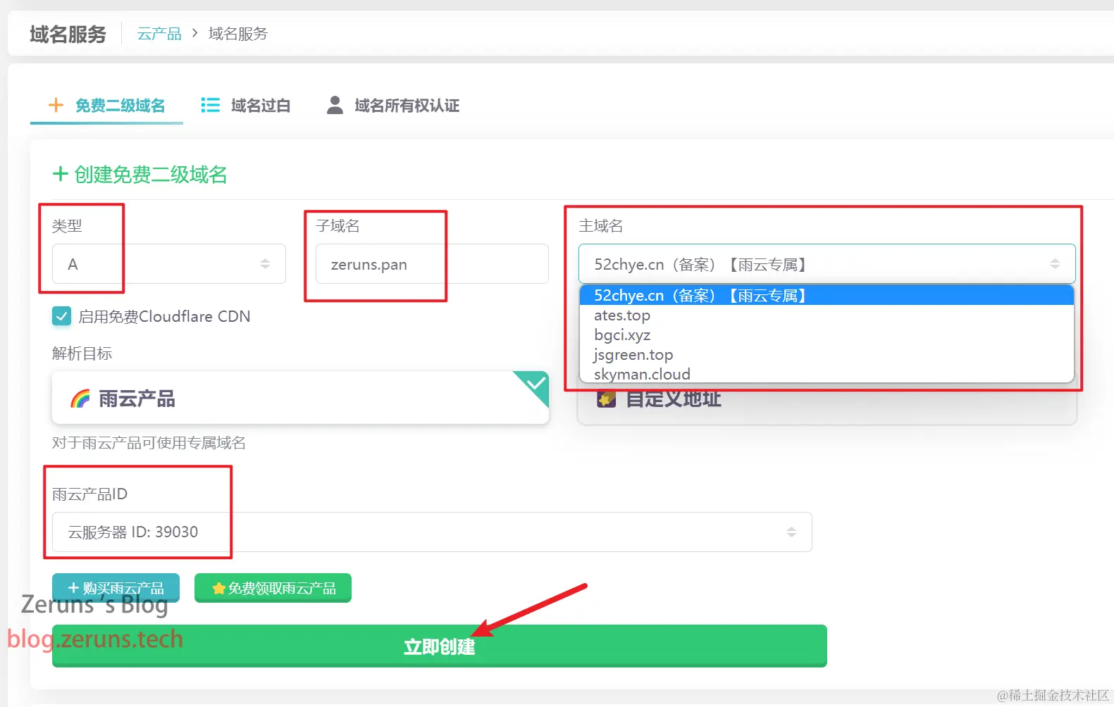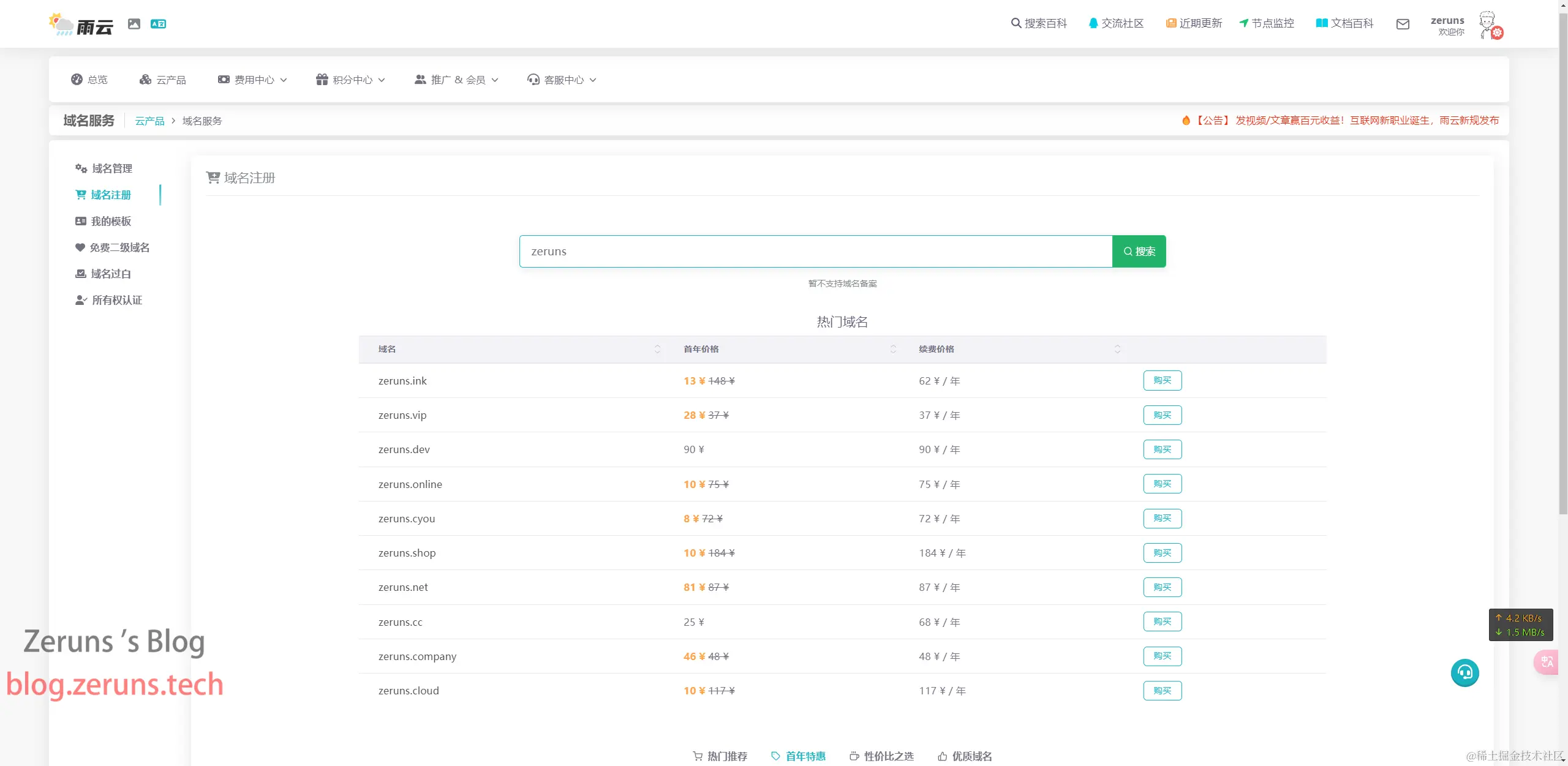 下面以雨云的为例,注册一个zeruns.top的域名。